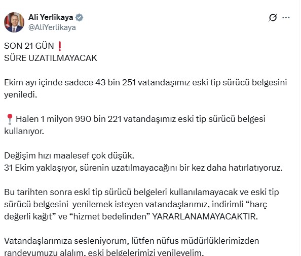Sosyal medya üzerinden yaptığı açıklamada, yalnızca ekim ayında 43 bin 251 kişinin başvuru yaptığını belirten Yerlikaya, hala yaklaşık 2 milyon vatandaşın eski ehliyet kullandığını ifade etti. 31 Ekim sonrası bu belgelerin geçersiz olacağını hatırlatan Bakan, vatandaşlara çağrıda bulundu: “Lütfen randevunuzu alın, ehliyetinizi yenileyin.”
