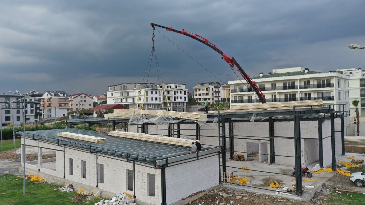 Proje kapsamında binaların çatı panellerinin montajı ve duvar örme işlemleri hızla ilerliyor.