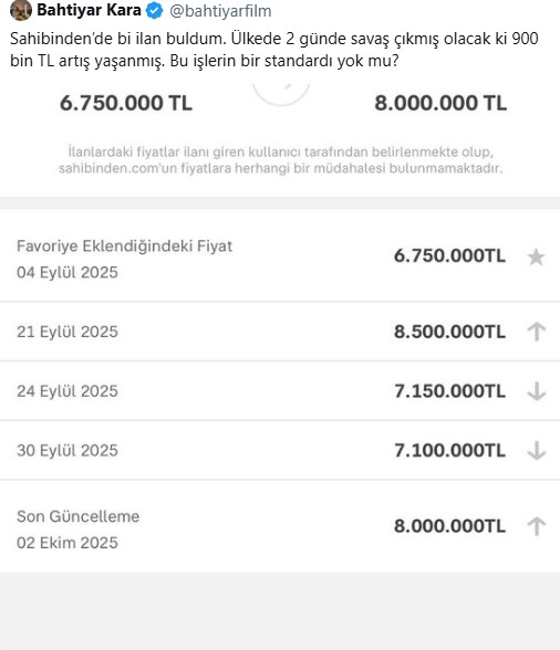 İncelemeye göre, söz konusu evin ilan fiyatı 1 Eylül 2025 tarihinde 6 milyon 750 bin TL olarak kayıtlara geçti. Ancak sadece bir ay sonra, 2 Ekim 2025’te fiyat 8 milyon TL’ye çıkarıldı. İlanın bireysel bir kullanıcıya ait olduğu ve herhangi bir emlak şirketine bağlı olmadığı da belirtildi. Fiyat değişiminin gerekçesiz ve piyasa dışı olması nedeniyle, ilan sahibi hakkında cezai işlem başlatıldı.