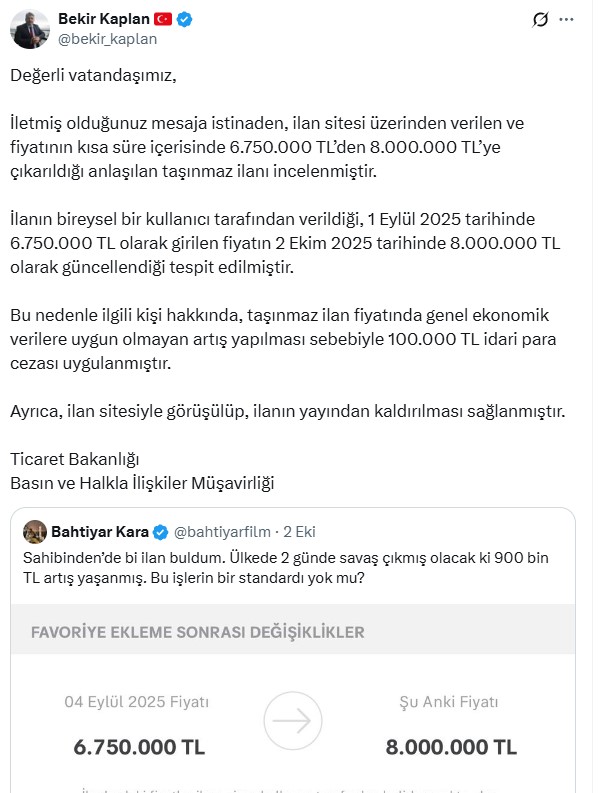 Sosyal medya platformu X üzerinden yapılan ihbar üzerine devreye giren Ticaret Bakanlığı, fiyat artışının ekonomik göstergelerle örtüşmediğini belirledi. Bakanlığın Basın Müşaviri Bekir Kaplan, yaptığı açıklamada, “İlan sitesi üzerinden verilen ve fiyatı kısa sürede 6 milyon 750 bin TL’den 8 milyon TL’ye yükseltilen konut ilanı detaylı şekilde incelendi. Artış, genel ekonomik verilerle bağdaşmadığı için 100 bin TL idari ceza uygulanmıştır” dedi. İlgili ilan da platformdan kaldırıldı.