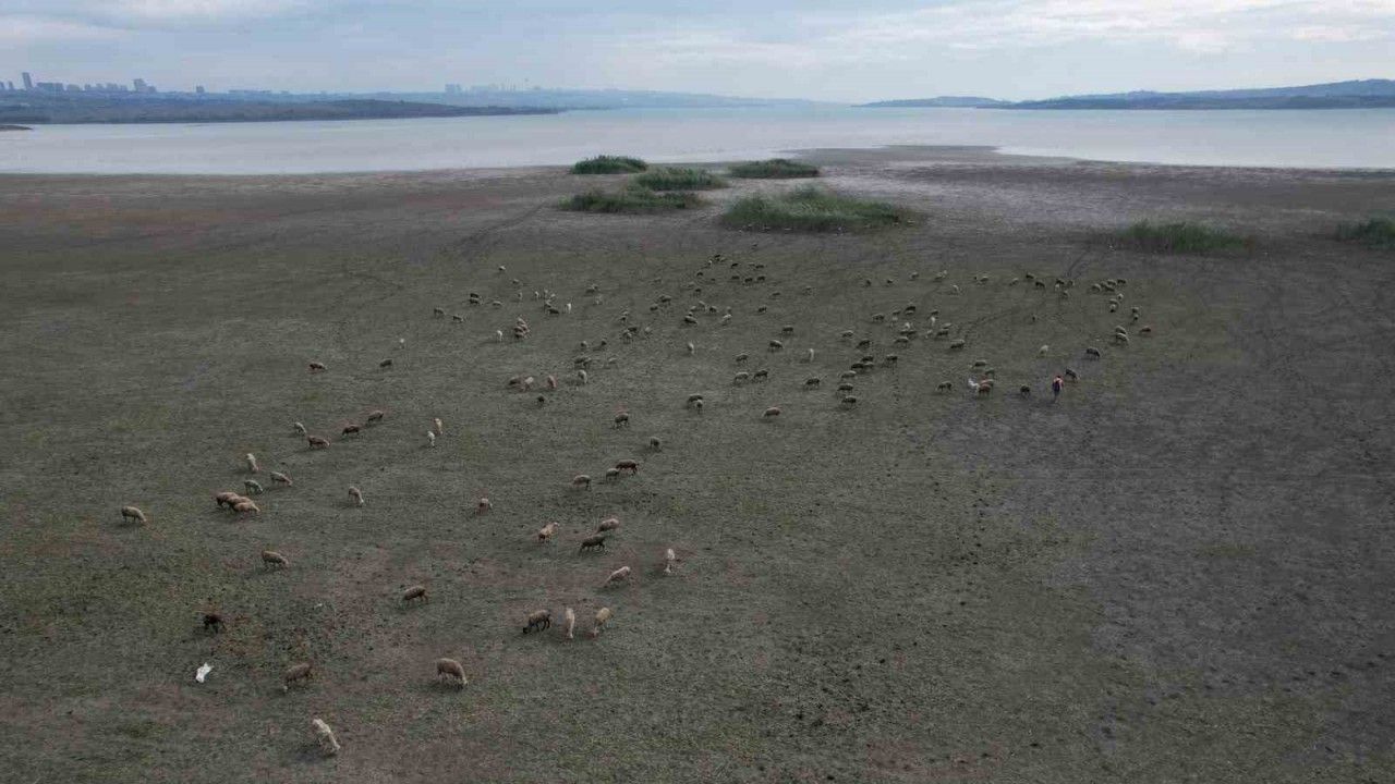 Büyükçekmece Gölü’nün çevresinde yapılan gözlemler, kuraklığın boyutunu bir kez daha ortaya koydu. Dronla havadan çekilen görüntülerde, gölün büyük bir bölümünün kuruduğu net şekilde görülüyor. Su çekilmesiyle birlikte ortaya çıkan toprak alanlar, bölgedeki çobanlar tarafından otlatma alanı olarak kullanılmaya başlandı. Kuruyan zeminlerde onlarca koyunun otladığı görüntüler, gölün geldiği noktayı gözler önüne seriyor.