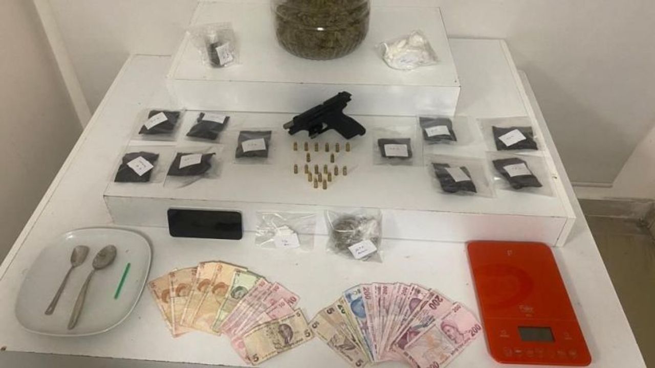 Olay, geçtiğimiz gün saat 15.30 sıralarında Pendik Orhangazi Mahallesi Betül Sokak'ta meydana geldi. Pendik İlçe Emniyet Müdürlüğü Asayiş Büro Amirliği ekipleri tarafından yürütülen çalışmalar dahilinde, 6136 sayılı Kanuna muhalefet ve uyuşturucu madde ticareti suçlarından hakkında işlem yapılan E.Ö. (29) isimli şahsın evinde ve aracında arama yapıldı. Teras katı dairesi ile 34 D... 4... plakalı araçta gerçekleştirilen aramalarda; 1 adet BLOW TR 91402 Cal 9 mm P.A.K. ibareli ruhsatsız tabanca ve şarjöre basılı 6 adet 7.65 mm fişek, 13 adet ek fişek, 453 gram, 59.3 gram ve 26.9 gram olmak üzere toplamda 539.2 gram marihuana, 163 gram ve 3.1 gram olmak üzere toplamda 166.1 gram taş kokain, 96.4 gram uyuşturucu yapımında kullanılan A.M. maddesi, 1 adet hassas terazi, 1 cep telefonu ve 3.105 TL nakit para ele geçirildi.