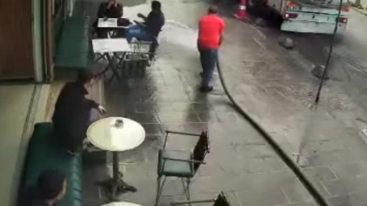Tazyikli su, kafe önünde oturup çay içen müşterilere yönelince kısa süreli panik yaşandı. Ne olduğunu anlamaya çalışan vatandaşlar, masalardan kalkarak kaçıştı. Yaşanan ilginç anlar, iş yerinin güvenlik kamerasına yansıdı.