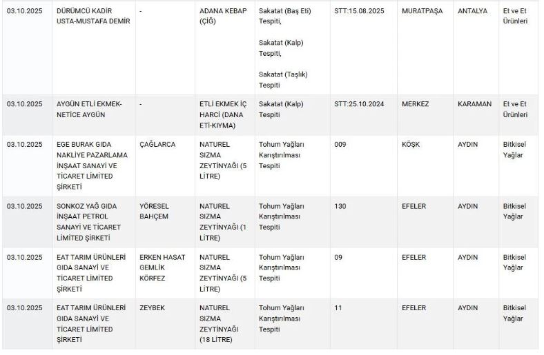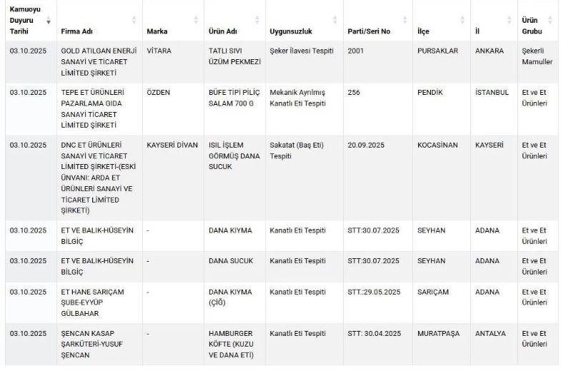 Güncellenen listede özellikle et ürünlerinde yapılan hileler dikkat çekti. Dana kıyma ve sucukta kanatlı eti, Adana kebapta ise kalp ve baş eti kullanıldığı ortaya çıktı. Listeye zeytinyağı, bal, pekmez ve bitkisel yağ gibi birçok ürün de eklendi.