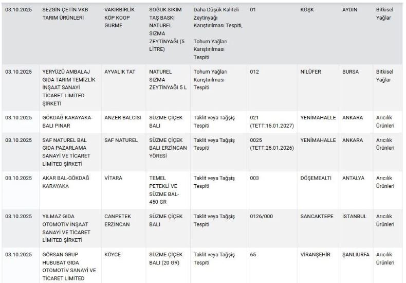 Et ürünleri kadar zeytinyağında da dikkat çekici usulsüzlükler tespit edildi. Bazı firmaların zeytinyağı adı altında piyasaya sürdüğü ürünlerde farklı bitkisel yağlar kullanıldığı ortaya çıktı. Bal örneklerinde ise doğal bal yerine glikoz şurubu kullanıldığı belirlendi. Bu tür hileli uygulamaların tüketiciye hem maddi hem de sağlık açısından zarar verdiği vurgulandı.