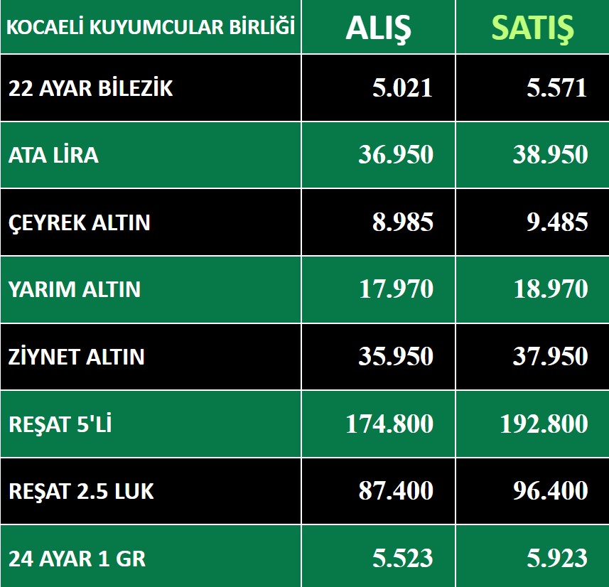 KOCAELİ KUYUMCULAR DERNEĞİNİN GÜNCEL ALTIN FİYATLARI