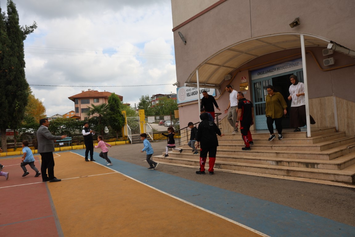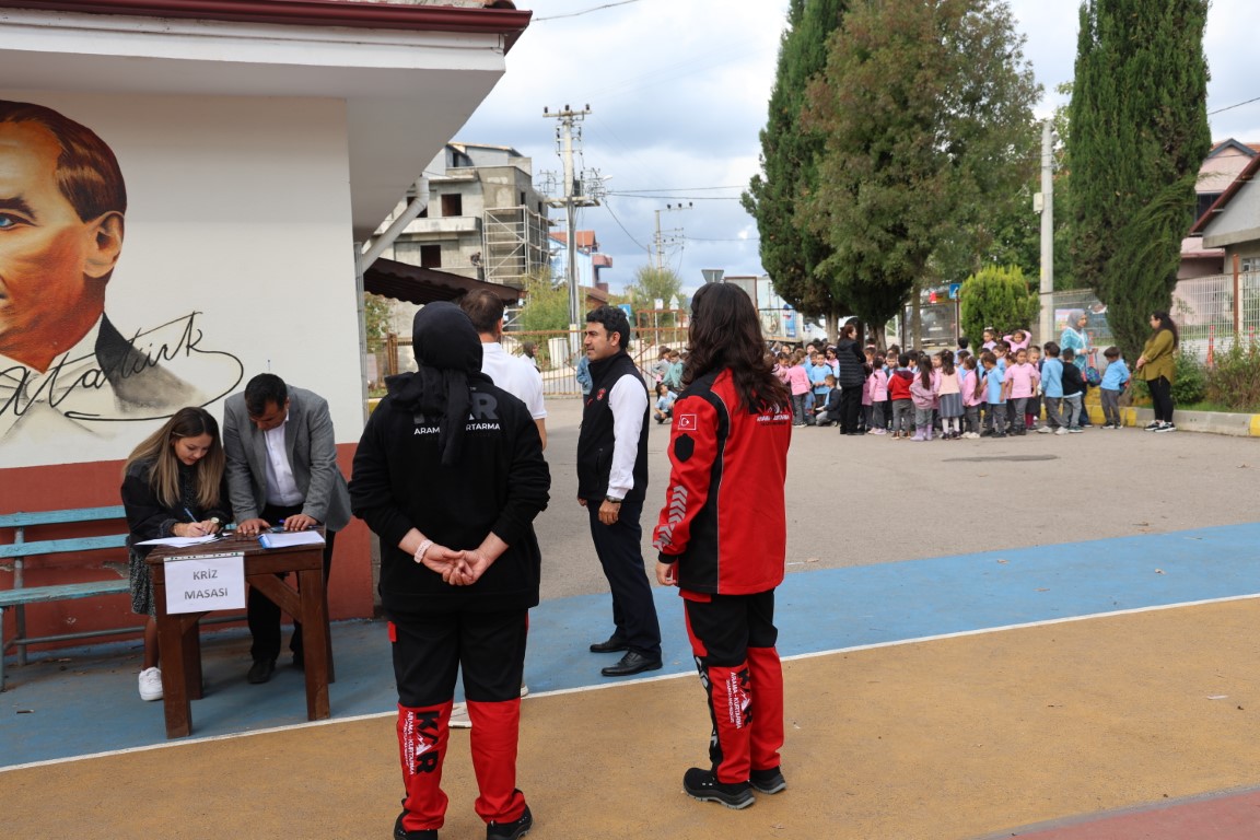Sınıf eğitiminin ardından okul bahçesine geçen öğrenciler, Kartepe Belediyesi Arama Kurtarma (KAR) Ekibi tarafından hazırlanan tatbikata katıldı. Burada çocuklara, afet anında yapılması gereken ilk hareket olan “çök, kapan, tutun” tekniği birebir uygulamalı olarak gösterildi. Tatbikat sırasında öğrenciler okulu kontrollü şekilde tahliye ederek toplanma alanında bir araya geldi. Olası bir afet senaryosunu canlandıran ekip, çocuklara doğru davranış biçimlerini yeniden hatırlatarak süreci pekiştirdi. Bu deneyim, sadece çocuklar için değil, öğretmenler açısından da kritik bir prova oldu.
