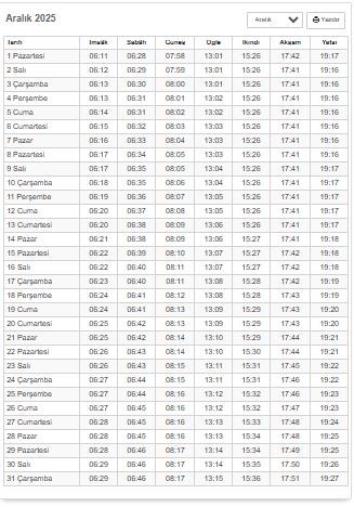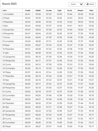 Öğle: 12:54, İkindi: 16:08, Akşam: 18:44, Yatsı: 20:02 Bu saatler mevsime, gün uzunluğuna ve astronomik konumlara bağlı olarak kısmen değişiklik gösterebilir.