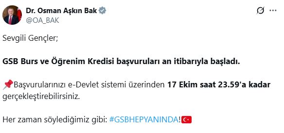 “Sevgili Gençler; GSB Burs ve Öğrenim Kredisi başvuruları an itibarıyla başladı. Başvurularınızı e-Devlet sistemi üzerinden 17 Ekim saat 23.59’a kadar gerçekleştirebilirsiniz. Her zaman söylediğimiz gibi: # GSBHEPYANINDA!”