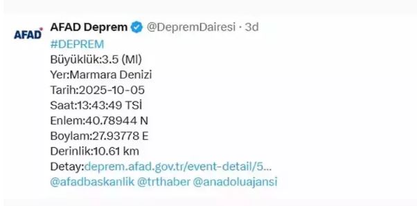 AFAD’ın verilerine göre Marmara Denizi açıklarında saat 13:43'te 3.5 büyüklüğünde bir sarsıntı yaşandı. Depremin 10,6 kilometre derinlikte meydana geldiği belirtiliyor. Öte yandan gün içinde büyüklükleri 0.8 ile 2.9 arasında değişen çok sayıda küçük deprem de kayda geçti.