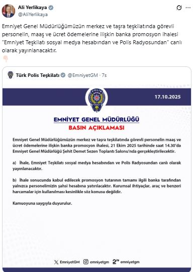 On binlerce emniyet mensubunun yakından takip ettiği banka promosyon ihalesi, bu kez kamuoyuna açık şekilde ve canlı yayınla gerçekleştirilecek. İçişleri Bakanı Ali Yerlikaya’nın duyurusuna göre, ihale süreci Emniyet’in sosyal medya hesapları ve Polis Radyosu üzerinden eş zamanlı olarak izlenebilecek. Bu kararla birlikte, hem şeffaflık sağlanacak hem de kamuoyunun sürece doğrudan tanıklığı mümkün olacak.