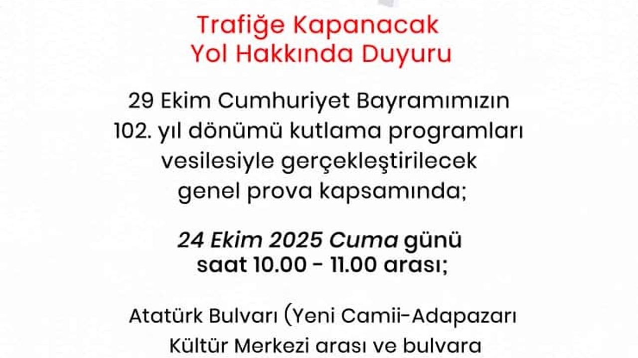 Yapılan duyuruda, 24 Ekim 2025 Cuma günü, kutlamaların provasının gerçekleştirileceği belirtilirken, Atatürk Bulvarı’nın çift yönlü olarak araç trafiğine kapatılacağı bildirildi. Trafik düzenlemesinin sabah saatlerinde başlayacağı ve prova tamamlanıncaya kadar süreceği kaydedildi.