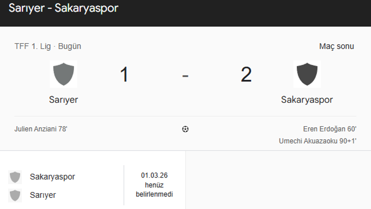 Trendyol 1. Lig’in 9. haftasında Sarıyer, kendi sahasında ağırladığı Sakaryaspor’a 2-1 mağlup oldu. Mücadelede iki takım da büyük bir mücadele sergilese de, Sakaryaspor uzatma dakikalarında bulduğu golle sahadan galip ayrıldı.