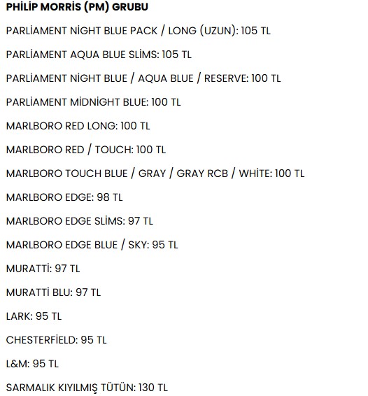Güncellenen fiyat listesine göre, Philip Morris grubunun en pahalı sigarası artık 105 TL’ye satılıyor. En ucuz sigara 95 TL olurken, ortalama fiyatlar 100 TL bandına oturdu. Bu artış, özellikle sabit gelirli tüketicileri doğrudan etkilerken, kaçak ve açık tütün satışlarında da artış yaşanabileceği öngörülüyor.