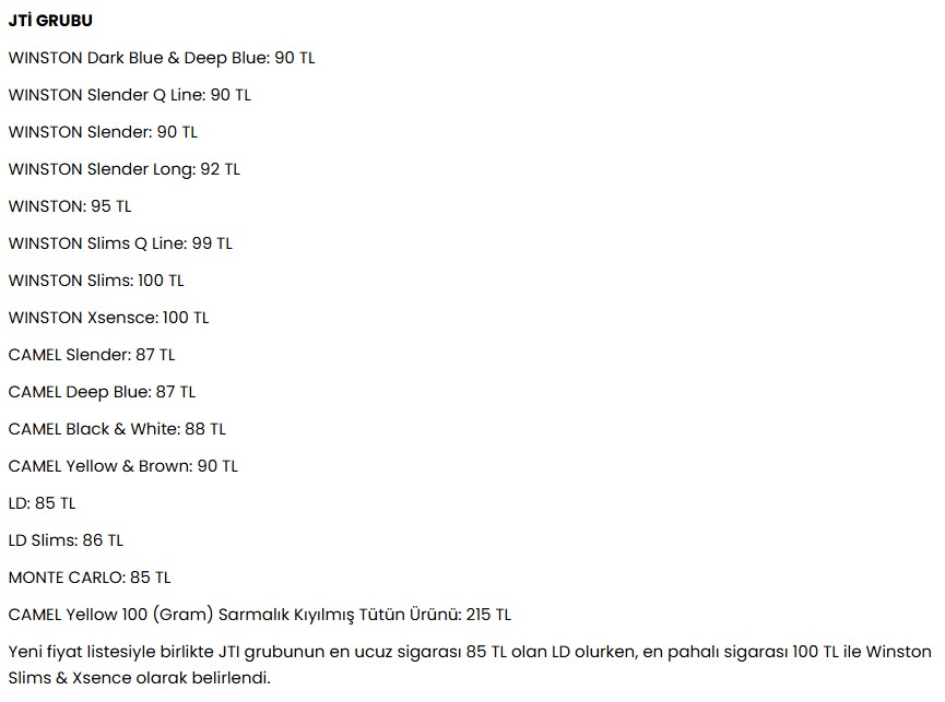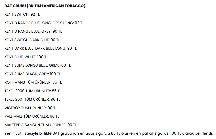 Türkiye Tekel Bayileri Platformu Başkanı Özgür Aybaş’ın sosyal medya hesabından yaptığı duyuruya göre, bir sigara grubunun ürünlerinde 5 TL’lik artış yaşandı. Yeni düzenlemeyle birlikte, en ucuz sigara artık 95 TL’ye satılıyor. Zam sonrası fiyatlar 100 ila 105 TL arasında değişiyor. Diğer üreticilerin de önümüzdeki günlerde benzer zamları uygulaması bekleniyor.