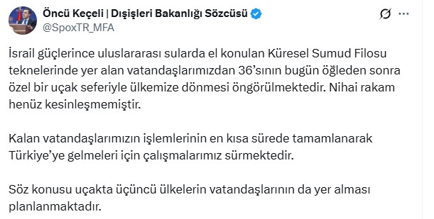 Dışişleri Bakanlığı Sözcüsü Öncü Keçeli, bugün öğle saatlerinde yaptığı açıklamada 36 Türk vatandaşının yurda dönüşünün planlandığını belirtti. Keçeli, açıklamasında şu ifadeleri kullandı: “İsrail güçlerince uluslararası sularda el konulan Küresel Sumud Filosu teknelerinde yer alan vatandaşlarımızdan 36’sının bugün öğleden sonra özel bir uçak seferiyle ülkemize dönmesi öngörülmektedir. Nihai rakam henüz kesinleşmemiştir. Kalan vatandaşlarımızın işlemlerinin en kısa sürede tamamlanarak Türkiye'ye gelmeleri için çalışmalarımız sürmektedir.” Ayrıca, dönüş uçağında yalnızca Türk vatandaşlarının değil, üçüncü ülkelerden bazı kişilerin de yer alacağı bilgisi paylaşıldı.