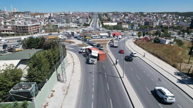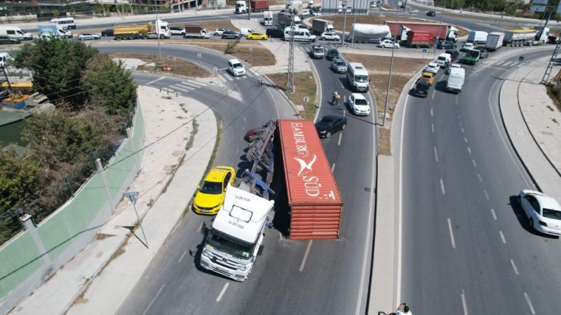 İstanbul Arnavutköy Eski Edirne Asfaltı Caddesi Hadımköy istikameti Haraççı Kavşağı’nda bir tırın dönüş yaptığı sırada arkasındaki kömür yüklü konteyner devrildi.