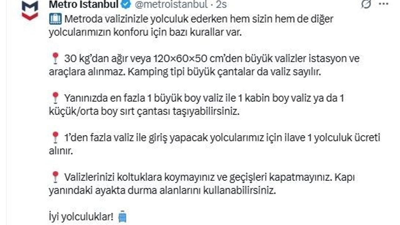 Metro İstanbul’un sosyal medya hesabından yapılan açıklamada, 30 kilogramdan ağır veya belli ebatlardan büyük valizlerin istasyon ve araçlara alınmayacağı buna ek olarak 1’den fazla valiz ile giriş yapacak yolculardan ilave 1 yolculuk ücreti alınacağı belirtildi.
